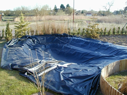 Damit spitze Steine, Wurzelwerk und andere Sachen die Folie im Laufe der Jahre nicht beschädigen oder gar durchstoßen wird ein Vlies (300g/m²) zuerst ausgebreitet. Darüber kommt die PE-Folie, welche 1,0 mm dick sein sollte. Jeweils 80 m² werden verlegt. Das Material hat im Sommer 2004 zirka 540 € gekostet.