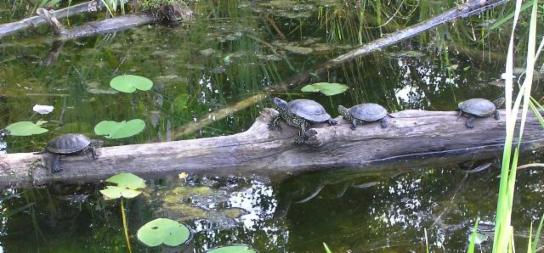 Blick auf die Schildkrötenanlage Diei Jungtiere nehmen ein Sonnenbad